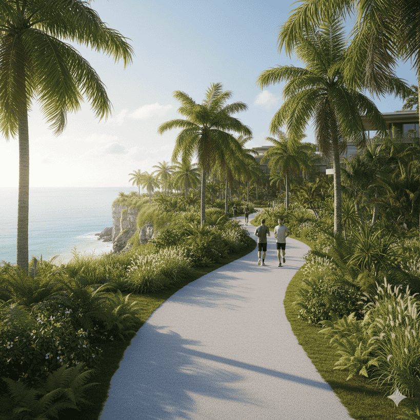 Jalur jogging yang menyatu dengan lanskap tropis kawasan.