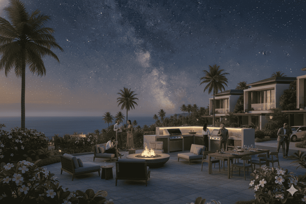 Area komunal dengan fasilitas BBQ dan fire pit untuk momen hangat di bawah langit malam.